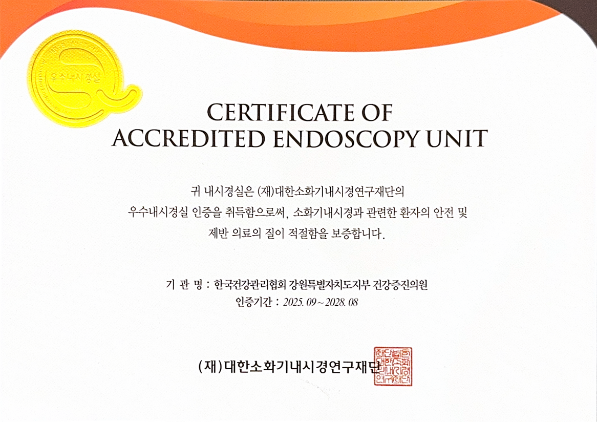 강원특별자치도지부는 (재)대한소화기내시경연구재단과 대한소화기내시경학회가 주관하는 '우수내시경실 인증 평가'에서 3회 연속 재인증을 받았습니다.